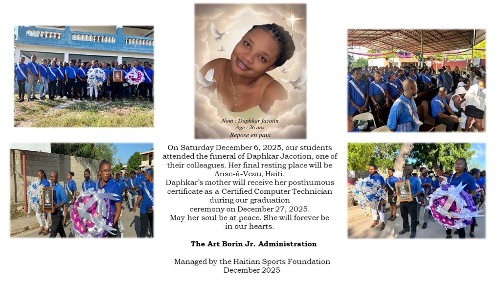 On Saturday, December 6, 2025, the students of Art Borin Jr. Professional School gathered in unity and grief as they attended the funeral of their colleague and friend, Daphkar Jacotin, whose final resting place is in Anse-a-Veau, Haiti.